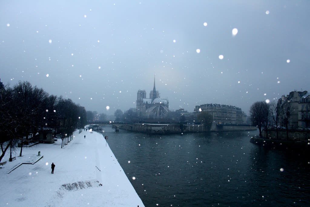 Snow falls over the Seine like thousands of drunken fireflies, with no place to land, and dissolves into the blackness.