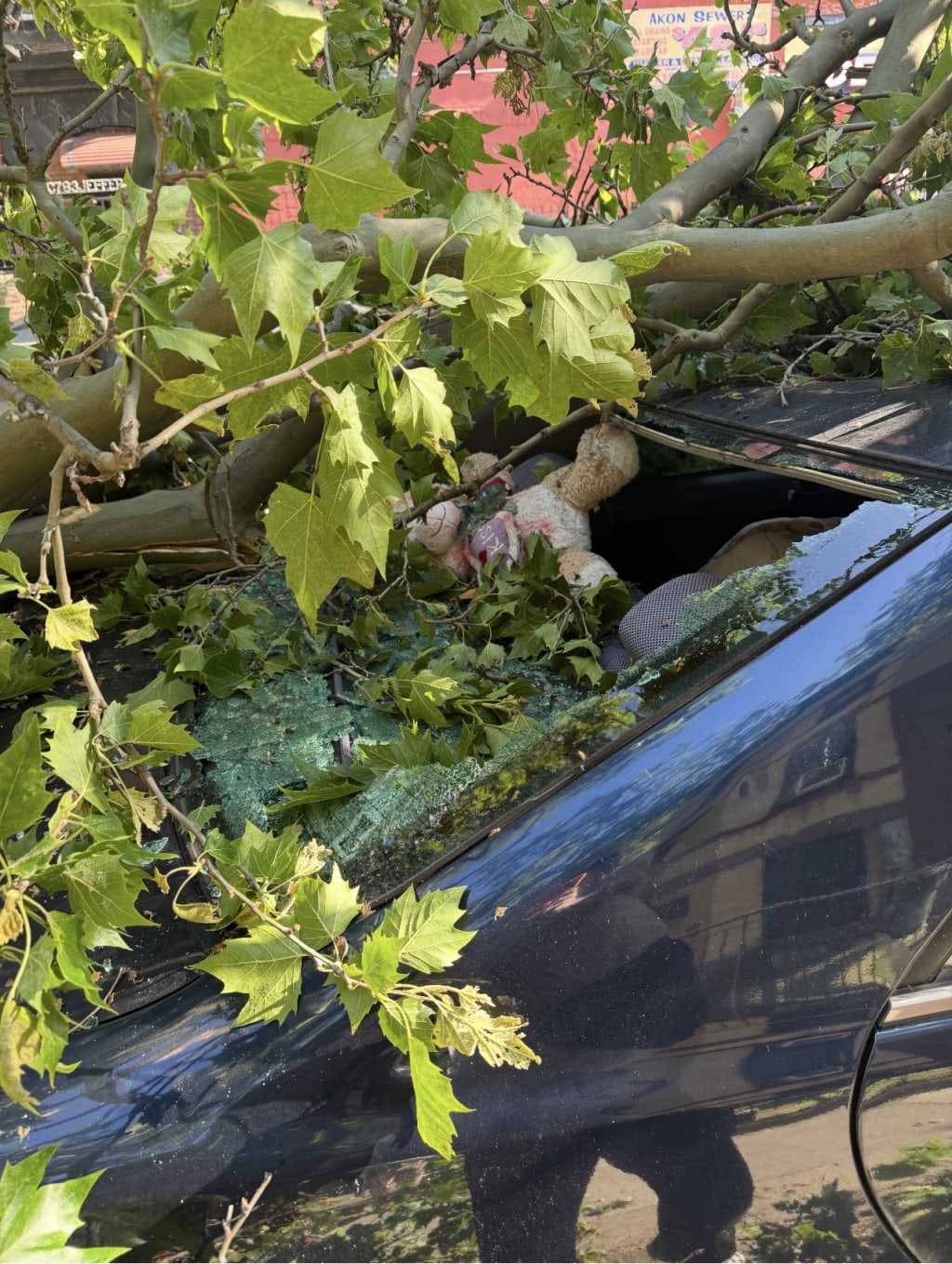 Sitting, not so securely, under the rarely experienced shade of those beautiful trees, she found herself, victim to the brunt force of a popup thunderstorm, that literally COVERED her car in shade.