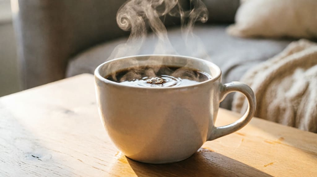 Steam curls from morning coffee