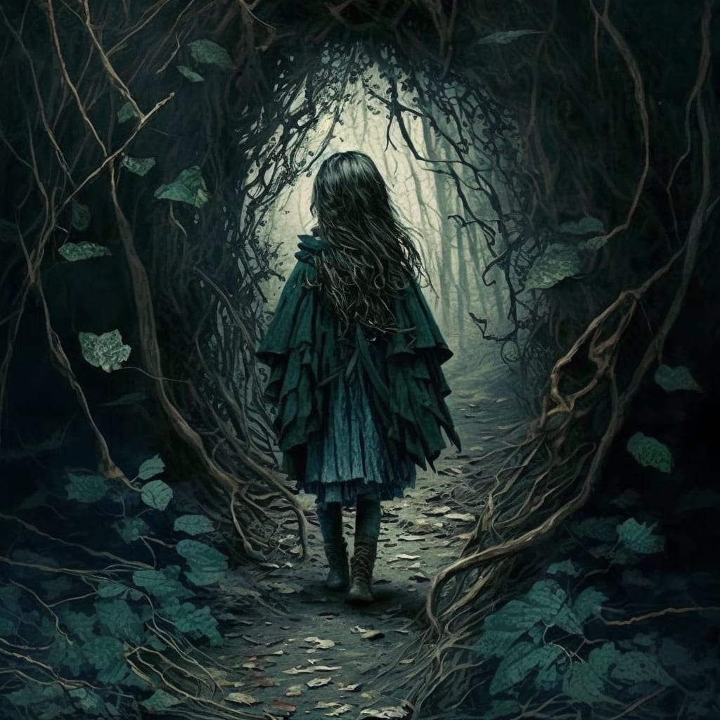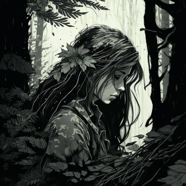 She walks in the shadows of the forest. Leaves, pine needles, and twigs crunching under her feet. She fears nothing here. She is the most powerful being in the forest. Crystals and coins clink in her pockets, echoing throughout the forest like dull church bells with every step.