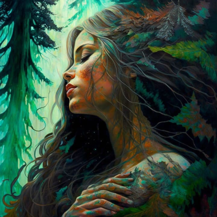 She pauses, breathing the soft musky scent of pine and wet earth. The cycles of life, death, and renewal entwine within the subtle layers of the scent. All her stress and doubts slither into the Earth. Earth's natural rhythmic vibrations pulse through her feet. Warmth spreads throughout her body as a gentle breeze tickles her skin like a warm loving embrace.
