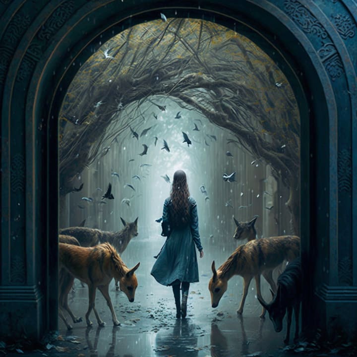 A procession of animals follow behind her as she steps through the archway. Mizzling rain falls over her. Soft serenity seeps into her, purifying her essence. Her senses renewed and revitalized for what lays beyond.