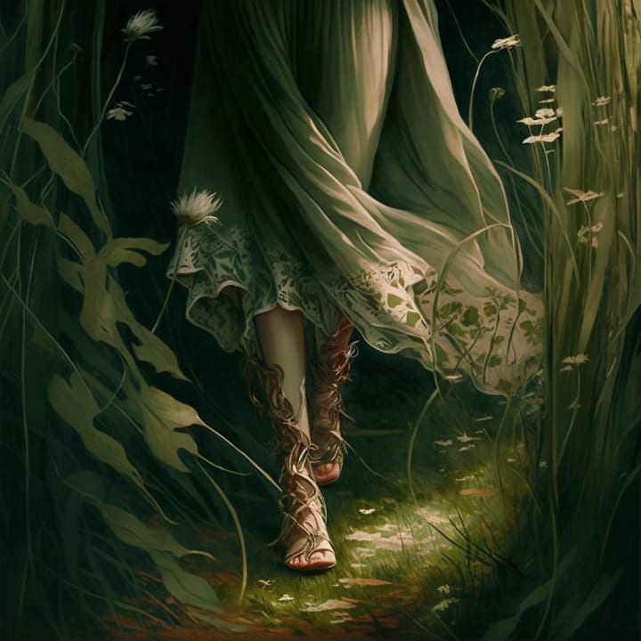 Her calves are caressed by velvet grasses. Her feet walk along the smooth silken path. She glides her fingers across the flora, hearing their songs of leisure and pleasure. The fauna prance and frolics around her.