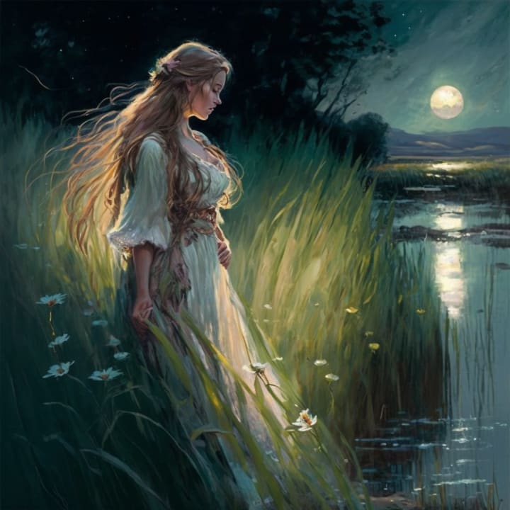 She roams into a gentle meadow with grasses swaying in the zephyr. She smiles with the sliver moon. Soft rays of moonlight brighten the glade revealing a loch. The light glistening across the still surface. She breathes in the scent of fresh water and mineral deposits.
