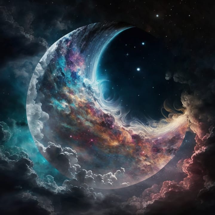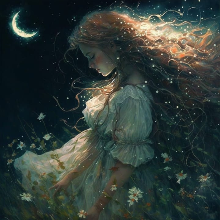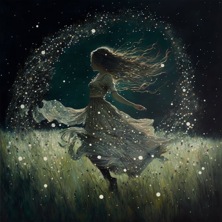 She stops dancing and lays in the grass. The rains have stopped. Everything is covered with sparkling dew. She stares at the night sky for a long while. The gentle breeze plays with her hair. The night sky seems to stay still and move in unison. Wisp-like clouds waft across the sky, keeping their boundaries as they mold into shapes. Stars twinkle as they continue their planetary movements. Moonbeams splash color across the clouds.