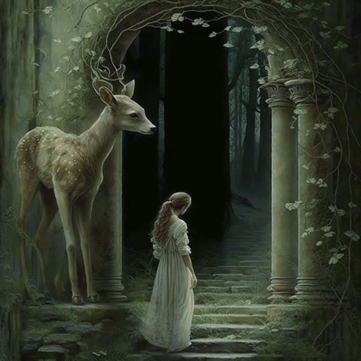 The animals converge behind her and follow like a wedding train. She pauses at the forest archway. She glances back not wanting to leave. Here she feels so sure of herself. She knows once she rejoins her reality everything will get muddled. One of the fawns nudges her through the archway. The fawn steps through as well and skitter around her disappearing into the forest. The gloom of twilight deepens to night.