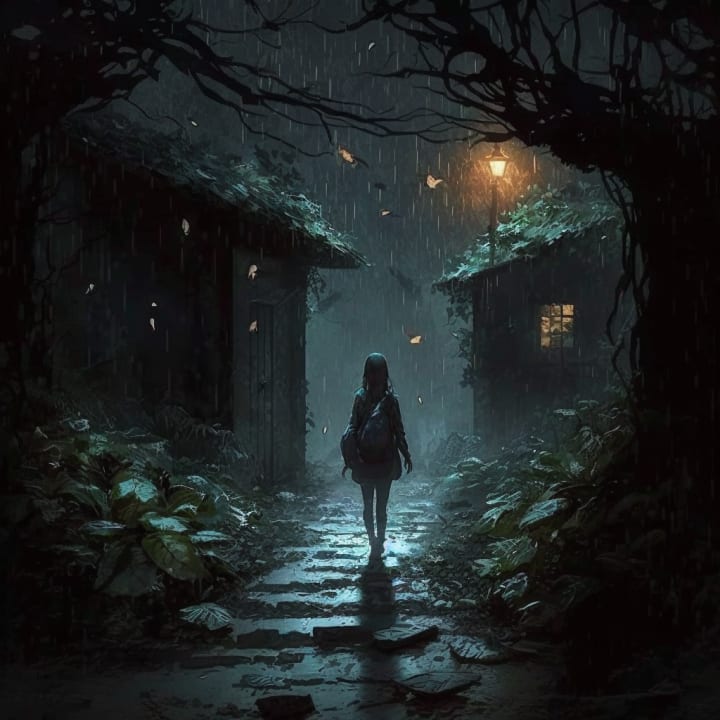She continues down the forest path covered in shifting shadows of darkness. The only light being fireflies and will-o-wisps. The ground becomes barren as she leaves the forest, giving way to cement and pavement. The rain drizzles down again filling rain gutters. The dilapidating buildings slowly become well-kept homes.