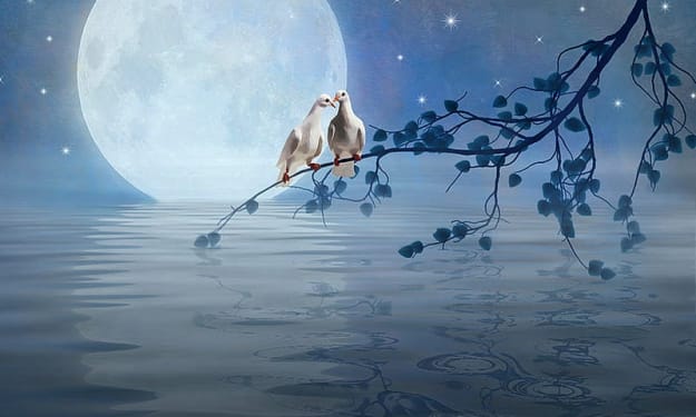 birds make love on a bed of blue; the secret kiss of sun and of moon