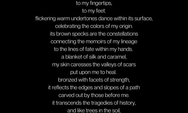 my melanin drenched skin has basked in the light of a thousand suns. ancestral gold drips from my crown, to my fingertips,