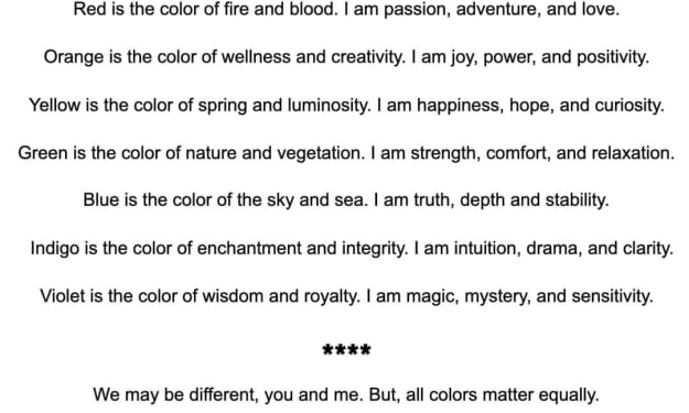 Red is the color of fire and blood. I am passion, adventure and love. Orange is the color of wellness and creativity. I am joy, power and positivity. Yellow is the color of spring and luminosity. I am happiness, hope and curiosity. Green is the color of nature and vegetation. I am strength, comfort and relaxation. Blue is the color of the sky and sea. I am truth, depth and stability. Indigo is the color of enchantment and integrity. I am intuition, drama, and clarity. Violet is the color of wisdom and royalty. I am magic, mystery, and sensitivity. We may be different, you and me. But, all colors matter equally. In my heart I hold no hate. I know love is innate. We are born to be friends, not foes. We are all the colors of a rainbow.