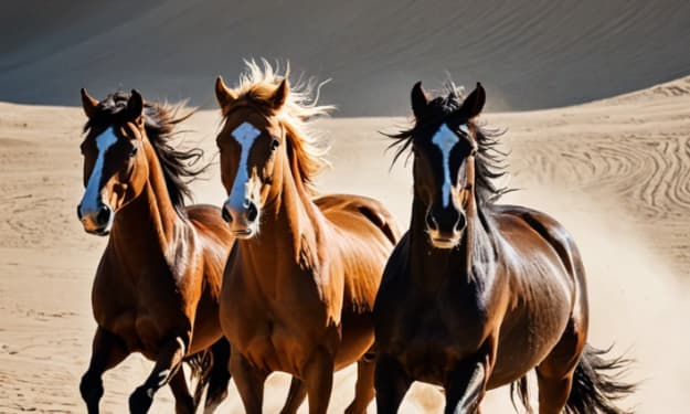 Sandstorm Stallions They thunder through the sand like gods unbound, Hooves slicing the silence, shaking the ground. Muscled shadows in sun-scorched gold,