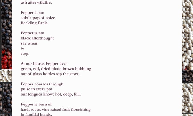 Pepper We call things what they are. Pepper is not dark speck dust ash after wildfire. Pepper is not subtle pop of spice