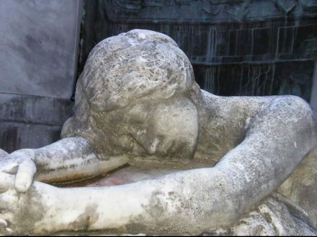 She touches the piercing cold, ceramic stone statue's hands.