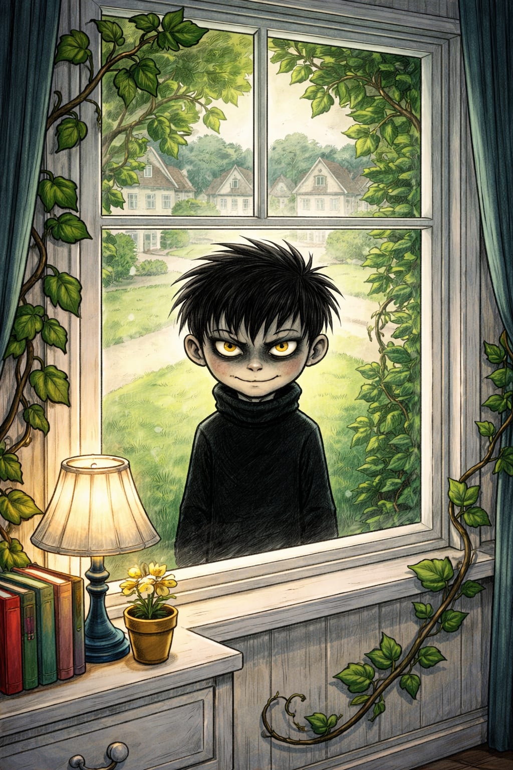 The windows white, green vines flat