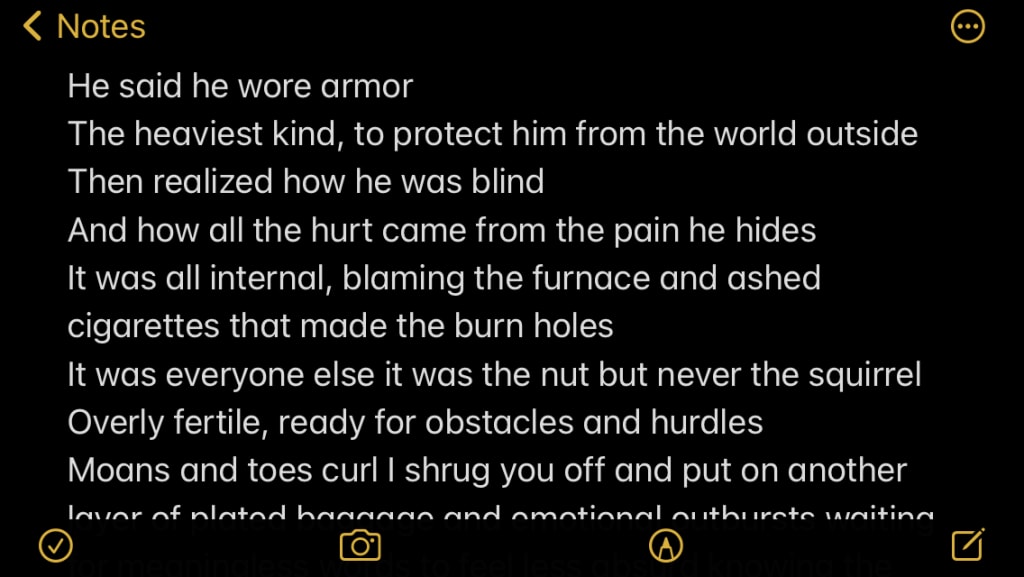 Moans and toes curl I shrug you off and put on another layer of plated baggage and emotional outbursts waiting for meaningless words to feel less absurd knowing the golden rule never expecting tables to turn
