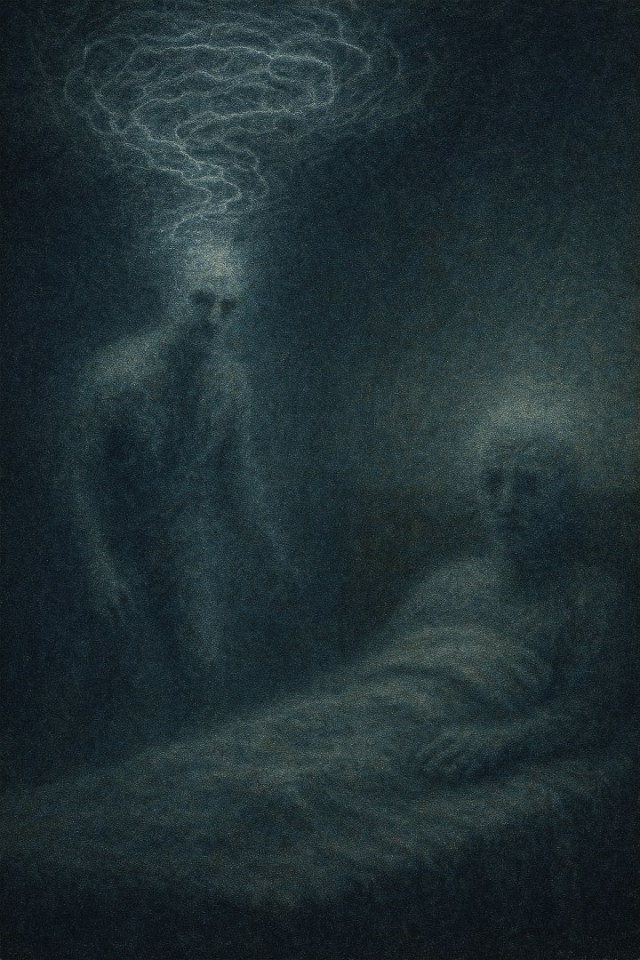 I was asleep in one body, while another self-walked toward the sound two blurred figures, frequency electricity swirling like a tornado, faces distorted in static. Chachi scratching at the door pulled the dream into waking, leaving the tone stereo, blurry, overlapping realms.