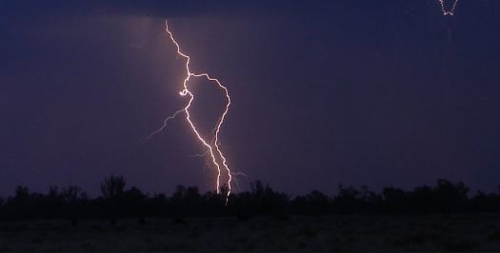A burst of bright white lightning illuminates the iron-grey sky, silent and violent, electrocuting a shaking pine-tree in its midst. The beast teeters on its legs for a second too long....and falls, emitting a deep groan as it hits the grass.