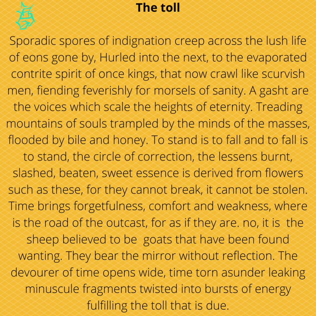 Sporadic spores of indignation creep across the lush life of eons gone by, Hurled into the next, to the evaporated contrite spirit of once kings, that now crawl like scurvish men, fiending feverishly for morsels of sanity. A gasht are the voices which scale the heights of eternity. Treading mountains of souls trampled by the minds of the masses, flooded by bile and honey. To stand is to fall and to fall is to stand, the circle of correction, the lessens burnt, slashed, beaten, sweet essence is derived from flowers such as these, for they cannot break, it cannot be stolen. Time brings forgetfulness, comfort and weakness, where is the road of the outcast, for as if they are. no, it is the sheep believed to be goats that have been found wanting. They bear the mirror without reflection. The devourer of time opens wide, time torn asunder leaking minuscule fragments twisted into bursts of energy fulfilling the toll that is due.