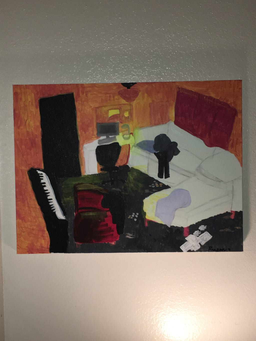 I paint your living room from memory. I bought a large canvas with the intent of painting it. I knew you were leaving soon and I had to capture a fleeting memory of the horrors I witnessed through you.