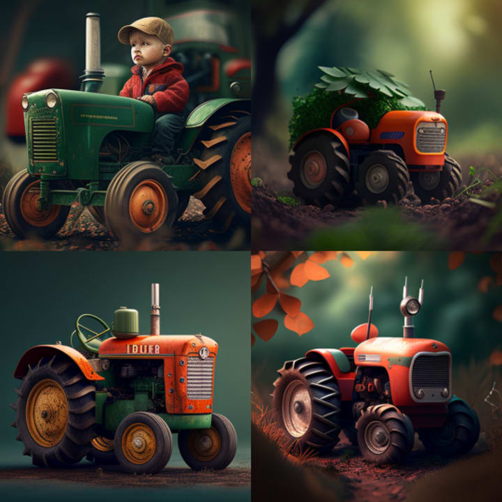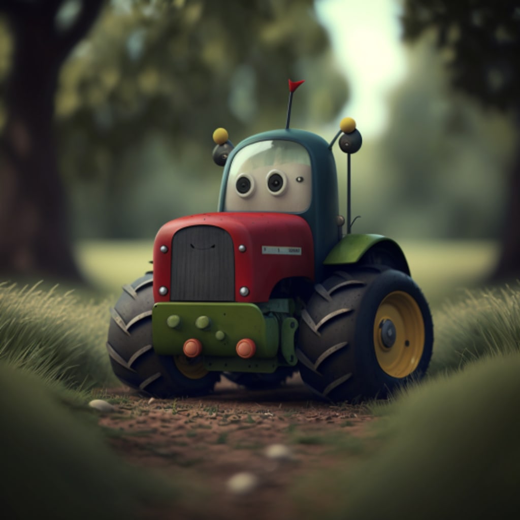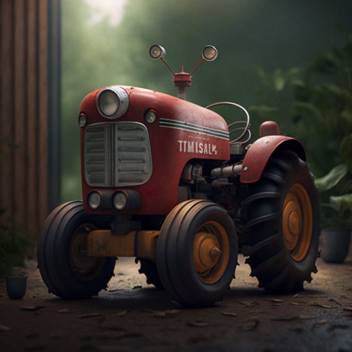 Once upon a time, there was a little tractor named Tommy. Tommy was a bright red tractor with big wheels and a shiny silver exhaust pipe. He lived on a farm with his owner, a kind farmer named Mr. Johnson. Tommy loved his job on the farm, plowing the fields and pulling heavy loads of hay. He was always eager to help Mr. Johnson with whatever task he needed.