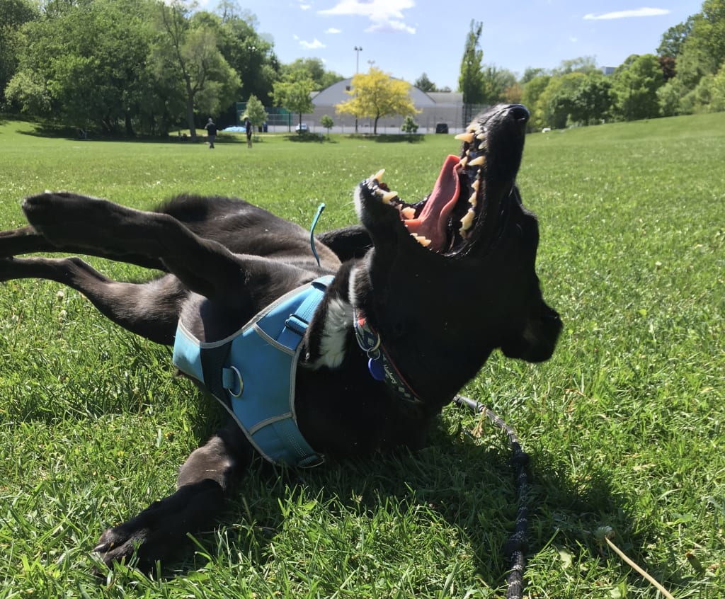 a happy black dog rubs its back on my skin.