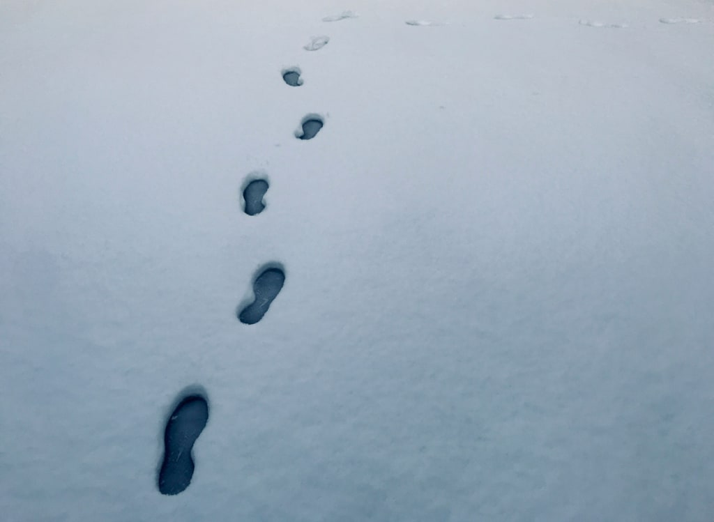 Footsteps on my lawn, alone,