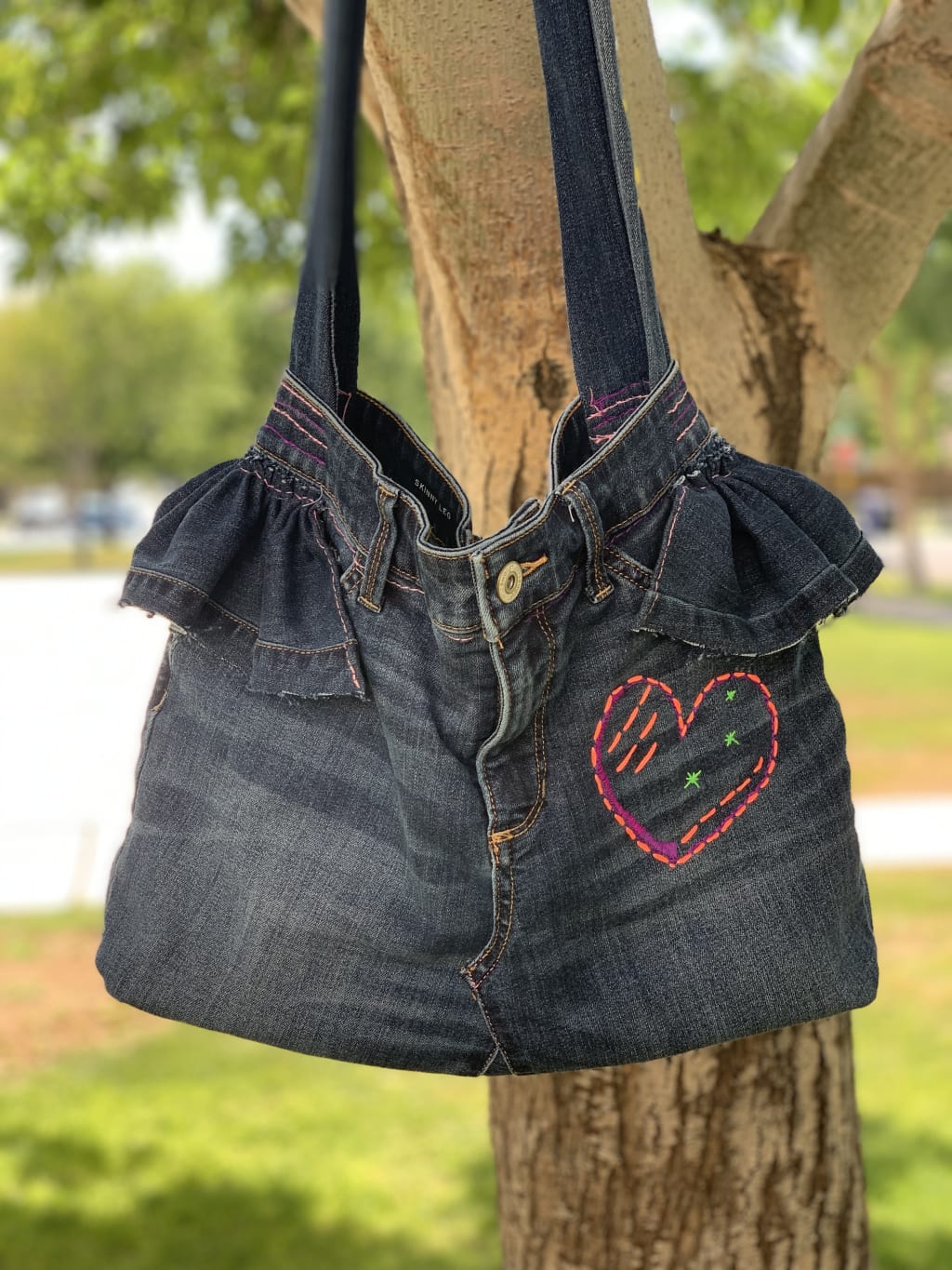 The bag, Yes. Chelsea smiled wanly and rose from her seat. She got herself comfortable on the brown sectional sofa and flicked on the tv. A wildlife documentary came on. With the strap in place, and the bottom of the bag sewn in, it was time for the fun part: the ruffles. She grabbed a pair of jeans from the stack, another dark wash, and cut two long strips of fabric with the orange handled scissors. After threading a needle with pink thread, she sewed in a gathering stitch on one side of each strip. A pull on the string and the fabric strip bunched into ruffles. With pins, she affixed the ruffles on either side of her bag, in line with the straps. She then began the process of hand-sewing the ruffles to the bag.