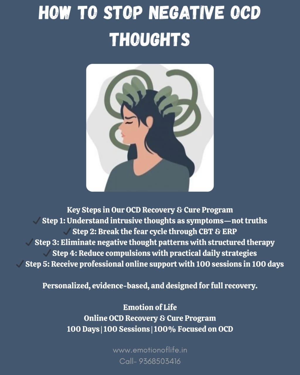 One of the most important steps in eliminating negative OCD thoughts is seeking professional help. While self-help strategies can be beneficial, professional guidance is essential in breaking the cycle of OCD. This is where Emotion of Life excels — through our OCD Recovery & Cure Program, we offer personalized online sessions that allow individuals to receive the support they need in the comfort of their own homes.