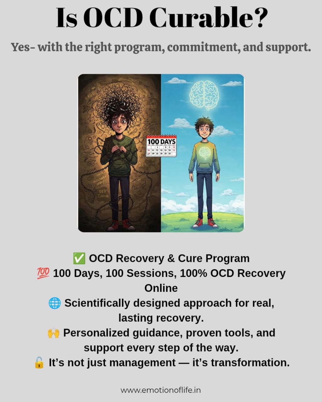 The idea of “cure” may sound bold in a clinical world where OCD is often termed lifelong. But Emotion of Life stands firm in its therapeutic promise: with consistency, internal correction of beliefs and time, OCD is curable completely without medication.