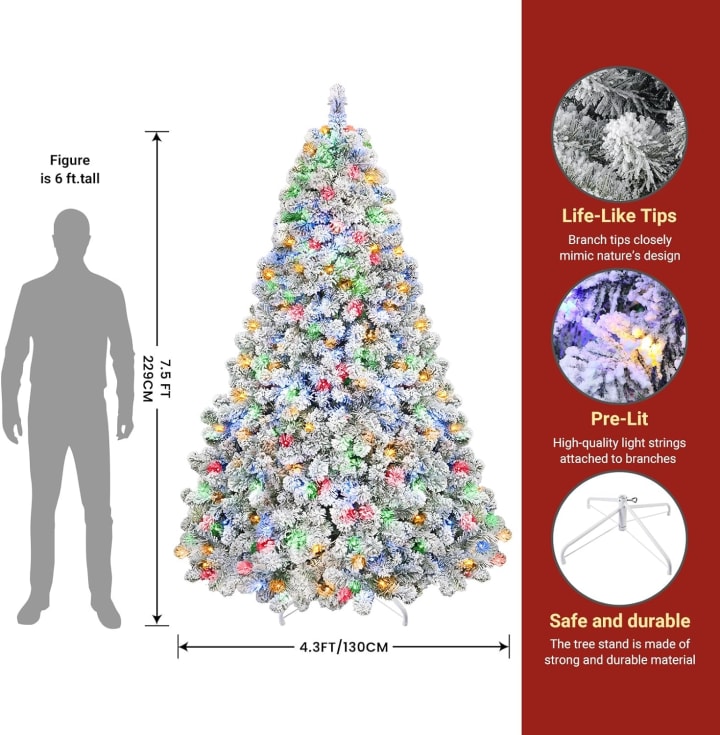 Shareconn 7.5ft Pre Lit Snow Flocked Artificial Holiday Christmas Tree: This 7.5-foot snow-flocked tree creates a winter wonderland in any space. Adorned with 470 warm white and multi-color lights, it exudes a cozy and festive glow. The lifelike snow-covered branch tips add a touch of elegance, making it suitable for home, office, or party decorations. Plus, its remote control feature allows convenient customization of lighting effects.