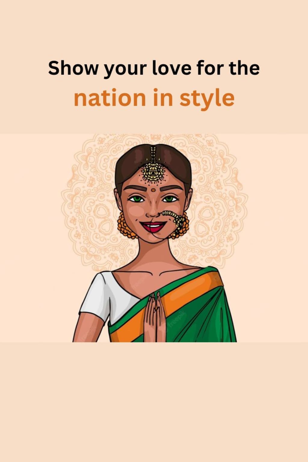 All tricolour: an all-white, all-orange, or all-green appearance. All you need to do is dress in a solid lehenga, suit, or saree in one of the tricolours, then accessorize with complementary items. Keep it understated because a solid-coloured dress may appear over the top with lots of accessories. Fix your hair elegantly and finish off your appearance with minimal or no makeup.