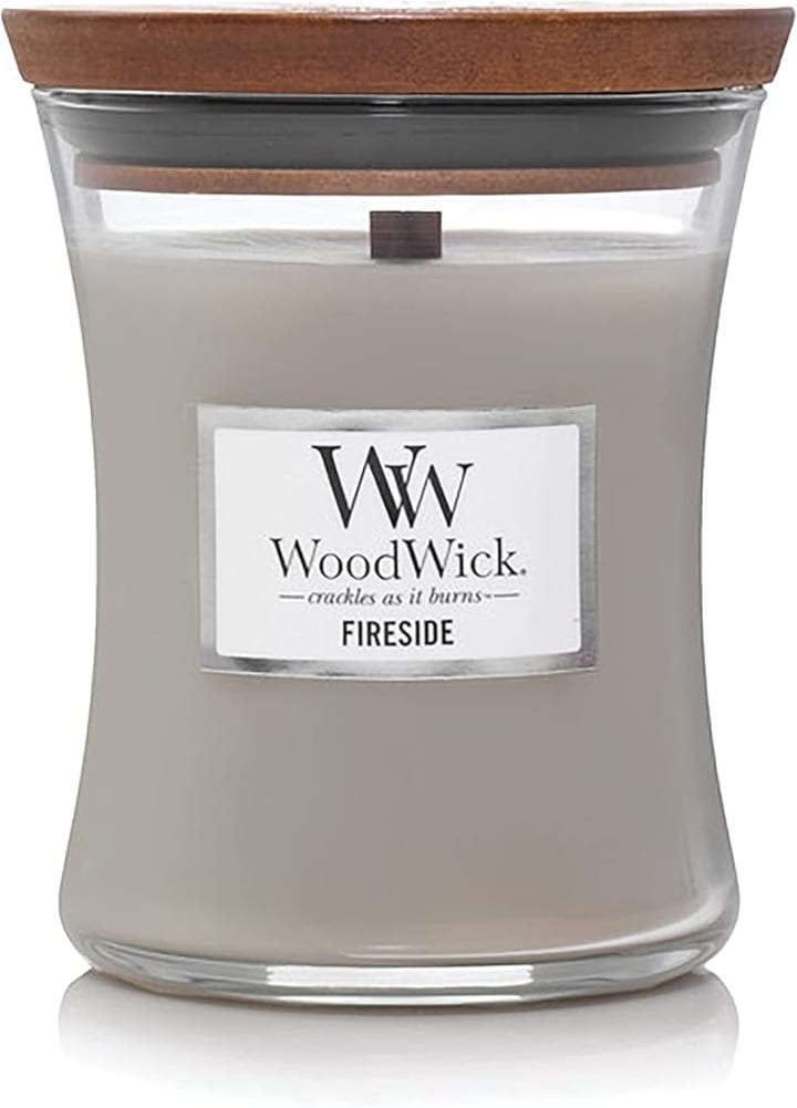 The WoodWick Medium Hourglass Candle in Fireside Scent offers a sensory experience that combines sight, sound, and scent. Its crackling wick and rich blend of amber, vetiver, and musk create a warm, inviting atmosphere.