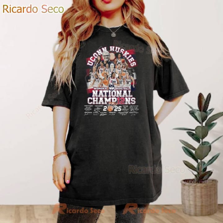 In conclusion, the **UConn Huskies 2025 NCAA Women’s Basketball Champions 12x Signatures T-Shirt** is more than just a piece of clothing; it’s a celebration of a remarkable achievement and a way for fans to express their loyalty to one of the most successful programs in women’s sports history. With its striking design, exceptional comfort, and commitment to sustainability, this shirt is a must-have for any UConn fan.