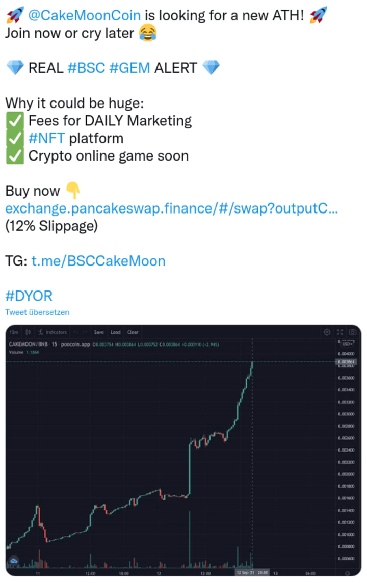 This tweet clearly advertises CakeMoon and suggests buying it now. Regardless of the hashtag #dyor at the bottom or the #nofinancialadvice in the profile.