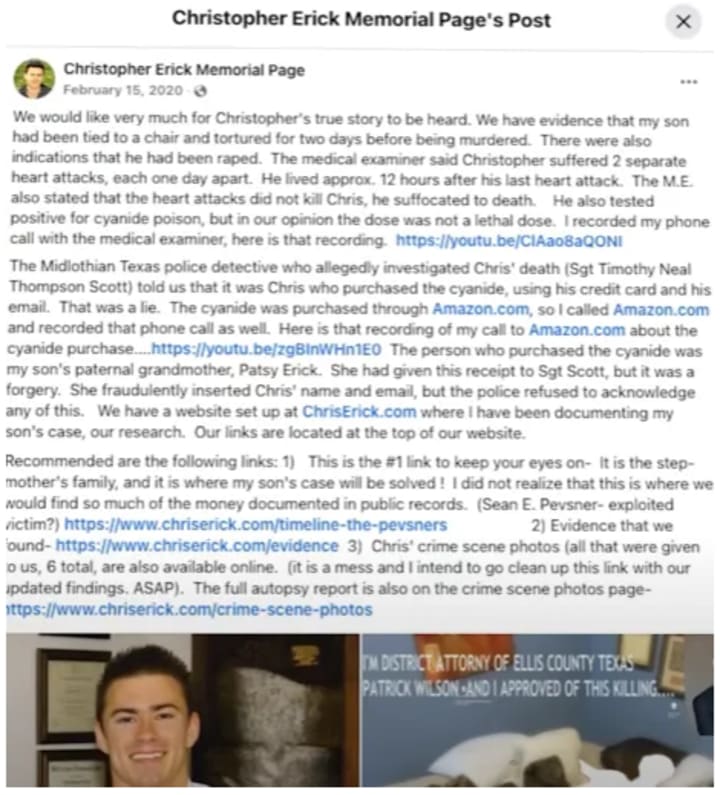 On 15th February 2020, she posted on Facebook that she possessed evidence indicating that, in the days leading up to his death, Christopher had been “tied to a chair and tortured for two days.”