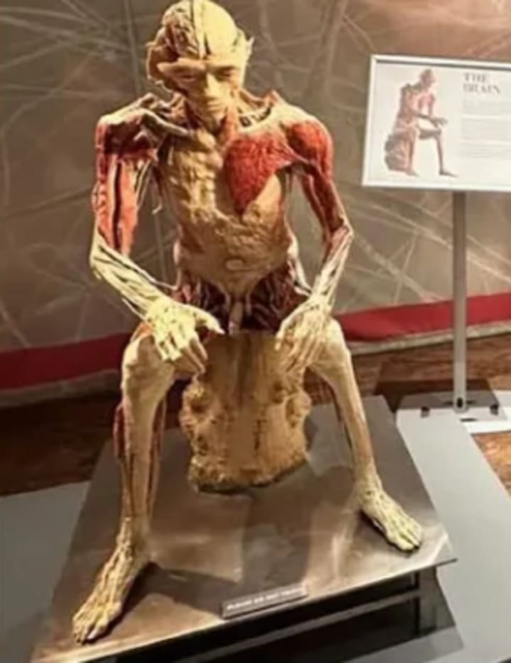 As she walked among the displays, her heart suddenly sank at one in particular. The figure titled “The Thinker” depicted a male corpse seated, appearing lost in deep thought.