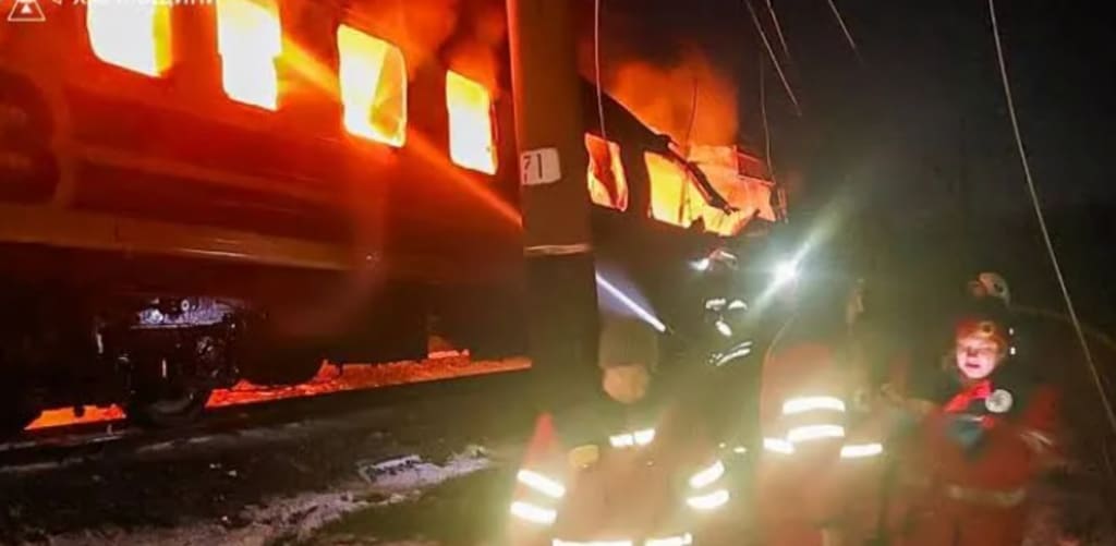 The train was carrying ordinary passengers — families, commuters, and travelers — not soldiers. Yet it became the target of three Iranian-made Shahed drones, striking in a rural area near the village of Yazykove. Rescue teams found charred carriages, chaos, and terrified passengers trying to escape the flames.
