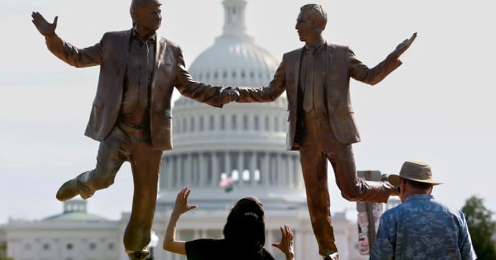 The sculpture appeared near the National Mall, one of the most symbolic public spaces in the United States. The statue portrayed Trump and Epstein standing together in a playful, exaggerated pose that appeared almost theatrical. The figures were shown smiling and holding hands, a visual style clearly designed to attract attention and provoke reaction.