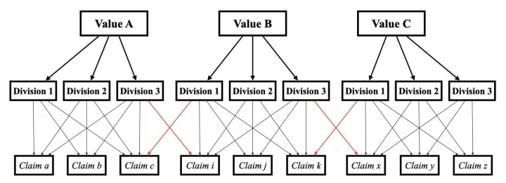 What is an ideology, political or otherwise? Broadly speaking, it's a series of claims about what we think is proper to do based on our values. Values are the ultimate justification we give when asked, "Why do you think x, y, and z?" Broad values - like, Equality, Liberty, Fairness - can be subdivided into more specific principles given a particular domain of experience; that subdivision can rationally give rise to distinct claims that are justified in terms of the value structure above. This is outlined in the diagram below which includes red arrows representing tension or conflict between subdivisions of values held by a single person. These conflicts are key to resolving the entire structure of a person's ideology because the friction between values are settled by an individual's preferences or personality, by the weight they give to each value. The key role of personality differences in determining the overall shape of an ideological model is part of the individual differences approach to understanding the psychology of polarization. It's important to note that social context plays an important role in shaping an individual's preferences; it's not all a matter of an individuals "innate" personality.