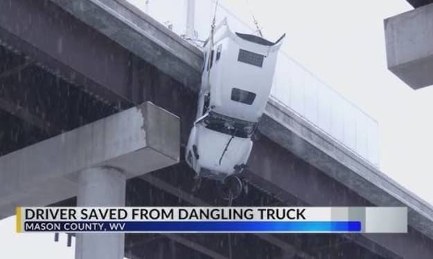 Driver Hoisted to Safety After Truck Dangles Over West Virginia Bridge. AI-Generated.