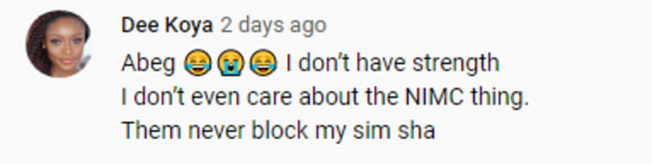 To be honest, this NIN NIMC thing is one of those things that creep me out. I’m just like what does this government want to do? Especially coming on the heels of this #EndSARS thing. I just feel like this is some way for them to monitor everybody more, or be more in control of everybody’s lives online. Just…they wan track una! Or they want a way where they can just say “let’s shut down all the lines”. If they have everybody’s details or numbers, they can pinpoint people and say block block block, shut shut shut. I don’t know – I feel – I don’t know if I’m correct. This is allegedly oh before anybody go and say Akah say. But I don’t know. I don’t know why.