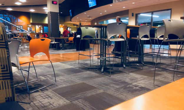 I'm sitting in a common or lounge room that doubles as a cafeteria of a small community college just over a mile away from the downtown area of a small city in the midwest. I've found the perfect spot with my back against the wall and a good view of everything that is going on around me. I'm done with class and really have no other reason to be here besides the better internet connection than at home. There are other smaller, more secluded spots around campus, but I choose the one with all the people in it. I know I don't sound like the introvert I probably am, but I rarely talk to anyone here. None of my friends from high school go here and most of them are done with college. Despite that, I kinda like being around all commotion. The people coming and going.