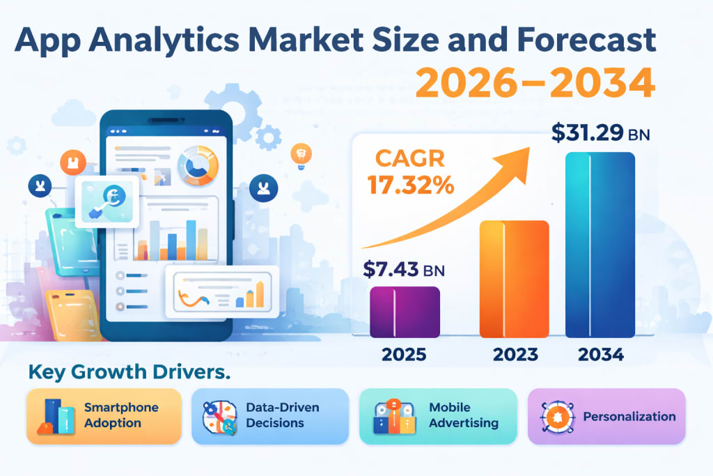 The App Analytics Market is entering a period of strong expansion as organizations increasingly rely on data-driven insights to optimize digital experiences. According to industry estimates, the market is projected to grow from US$ 7.43 Billion in 2025 to US$ 31.29 Billion by 2034, registering a compound annual growth rate (CAGR) of 17.32% from 2026 to 2034.