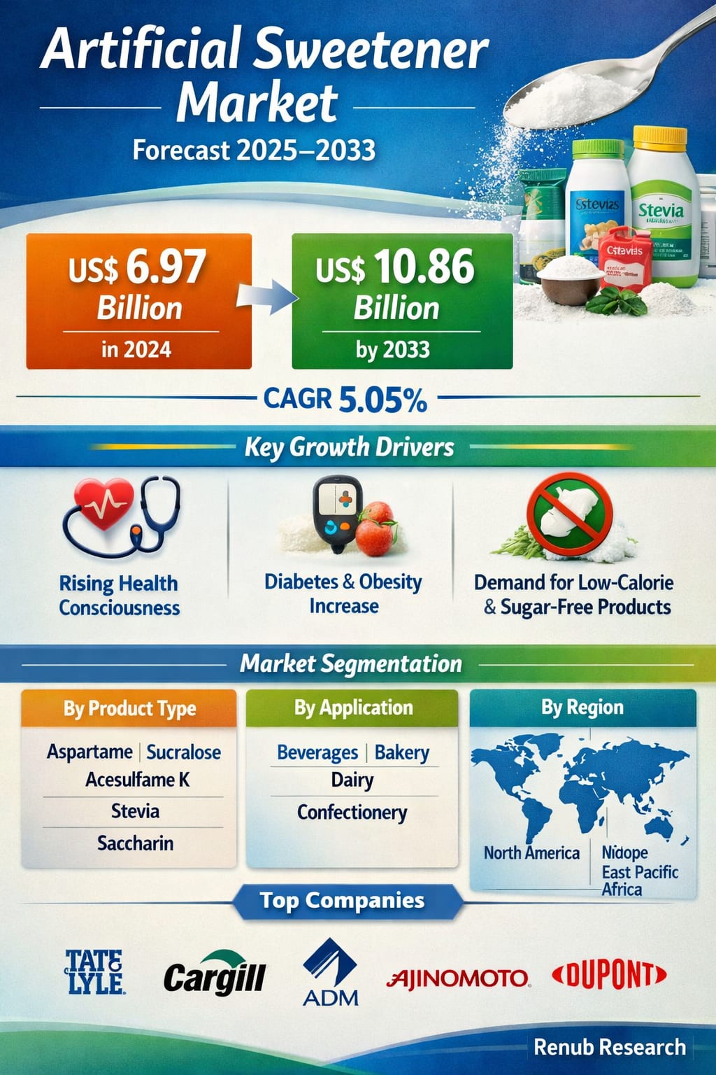 The global artificial sweetener market is undergoing a steady and transformative expansion as consumers increasingly move away from traditional sugar and toward healthier, low-calorie alternatives. According to Renub Research, the Artificial Sweetener Market is expected to reach US$ 10.86 billion by 2033, up from US$ 6.97 billion in 2024, growing at a CAGR of 5.05% from 2025 to 2033. This growth reflects a broader global shift in dietary habits, driven by rising health consciousness, increasing prevalence of lifestyle diseases, and strong demand for sugar-free and low-calorie food and beverage products.