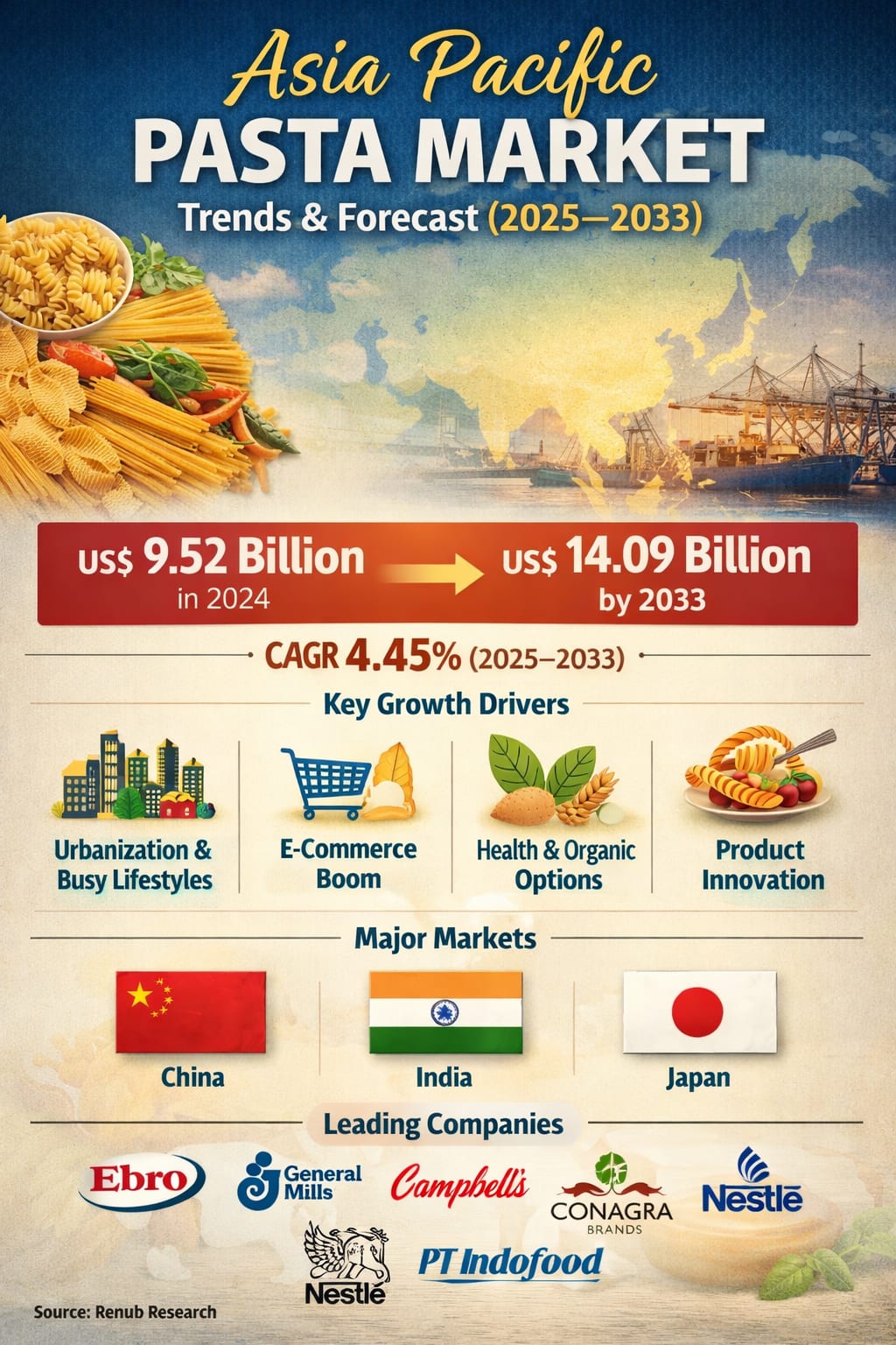 The Asia Pacific pasta market is steadily transforming from a niche Western food segment into a mainstream convenience staple across multiple countries in the region. According to Renub Research, the Asia Pacific Pasta Market is expected to reach US$ 14.09 billion by 2033, up from US$ 9.52 billion in 2024, growing at a CAGR of 4.45% from 2025 to 2033. This growth reflects a powerful combination of changing lifestyles, rapid urbanization, rising disposable incomes, evolving food preferences, and continuous product innovation by both global and regional food companies.