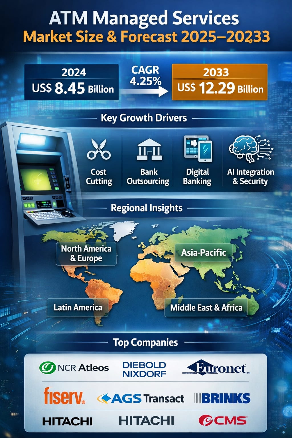 According to Renub Research, the ATM Managed Services Market is expected to reach US$ 12.29 billion by 2033, up from US$ 8.45 billion in 2024, expanding at a compound annual growth rate (CAGR) of 4.25% from 2025 to 2033. This growth is being driven by cost-cutting pressures on banks, rising outsourcing trends, increasing adoption of digital banking, the need for real-time monitoring, artificial intelligence (AI) integration, enhanced security requirements, and expanding ATM usage in developing cities.