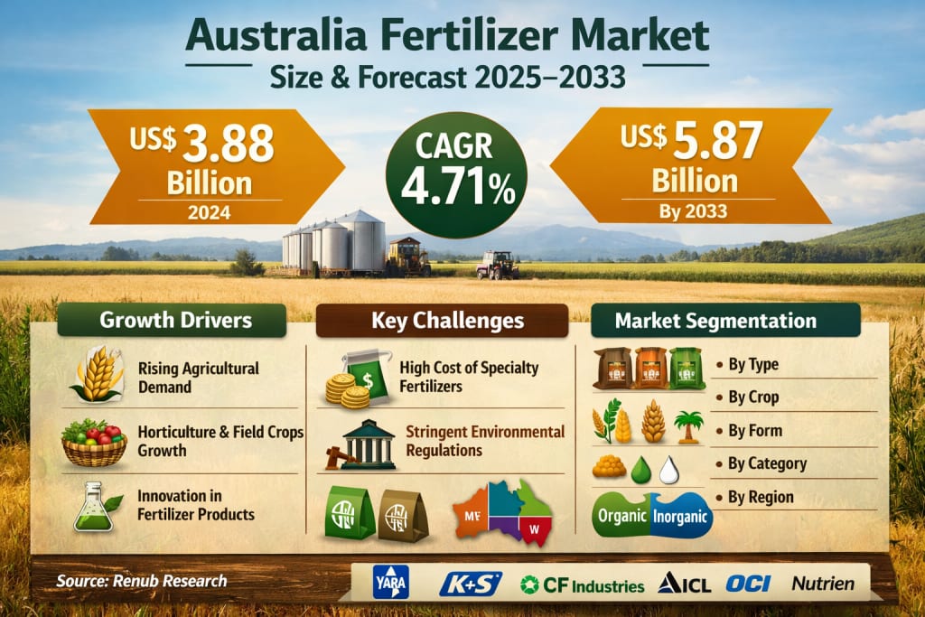 According to Renub Research, the Australia Fertilizer Market is expected to reach US$ 5.87 billion by 2033, up from US$ 3.88 billion in 2024, growing at a compound annual growth rate (CAGR) of 4.71% from 2025 to 2033. This steady expansion reflects a market in transition: one that is increasingly shaped by sustainability goals, precision farming technologies, and a growing preference for organic and bio-based inputs.