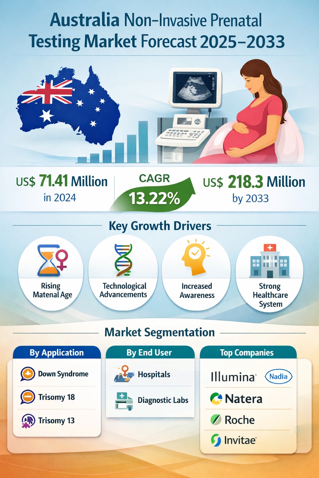 According to Renub Research, the Australia Non-Invasive Prenatal Testing Market is expected to grow from US$ 71.41 million in 2024 to US$ 218.3 million by 2033, registering a strong CAGR of 13.22% from 2025 to 2033. This impressive growth trajectory underscores how rapidly NIPT is moving from a niche offering to a mainstream healthcare service.