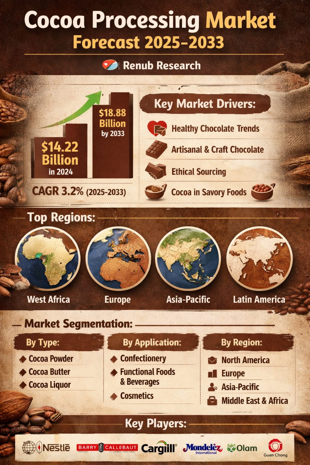 The Global Cocoa Processing Market is entering a new phase of steady and sustainable growth, driven by evolving consumer preferences, expanding applications of cocoa derivatives, and increasing focus on ethical and premium production practices. According to Renub Research, the market is expected to reach US$ 18.88 billion by 2033, up from US$ 14.22 billion in 2024, growing at a CAGR of 3.2% from 2025 to 2033.