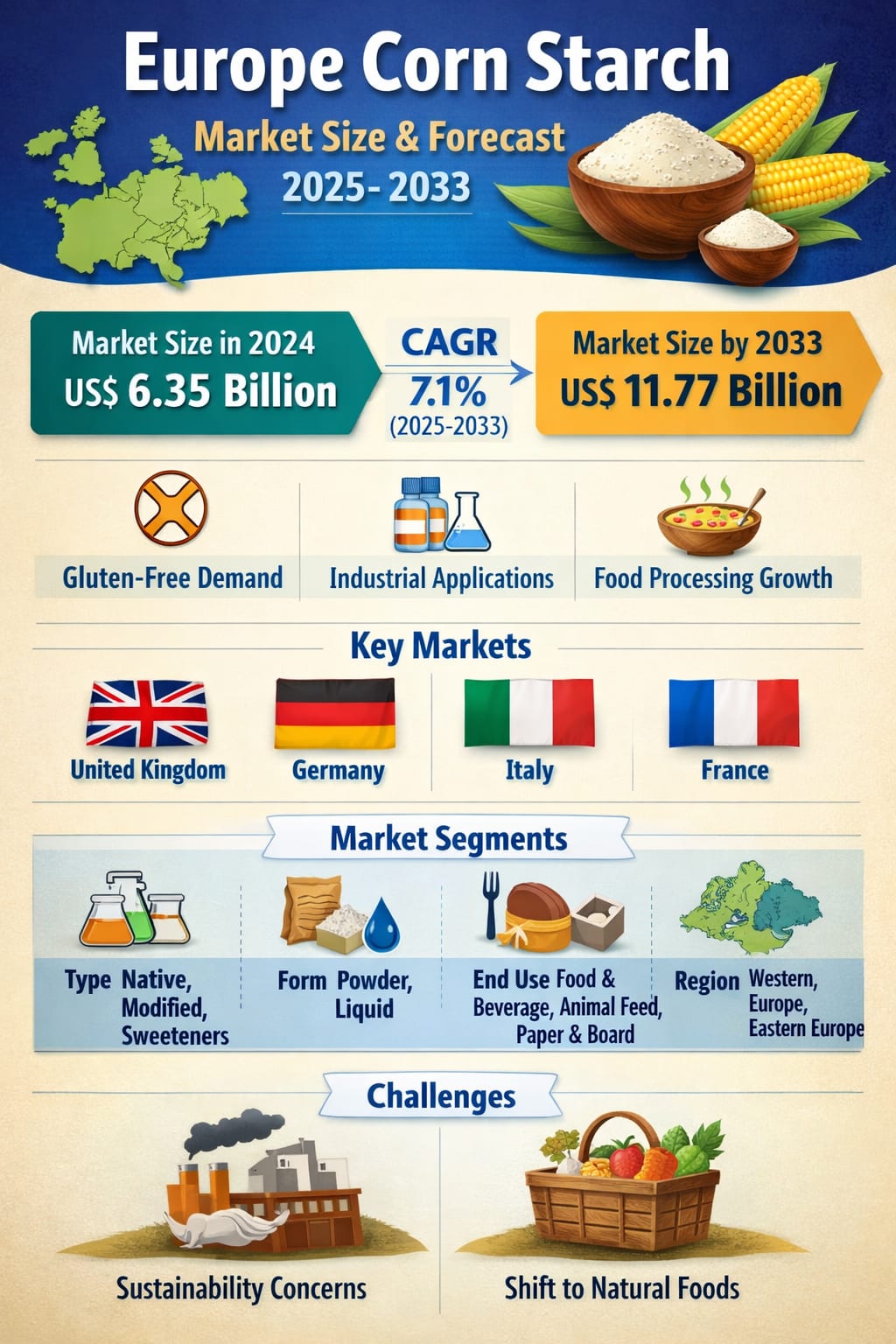 With the market projected to grow from US$ 6.35 billion in 2024 to US$ 11.77 billion by 2033 at a CAGR of 7.1%, the Europe corn starch industry is clearly entering a phase of accelerated and diversified expansion. No longer confined to traditional food applications, corn starch is emerging as a strategic material for pharmaceuticals, paper, textiles, and, most importantly, sustainable and biodegradable products.